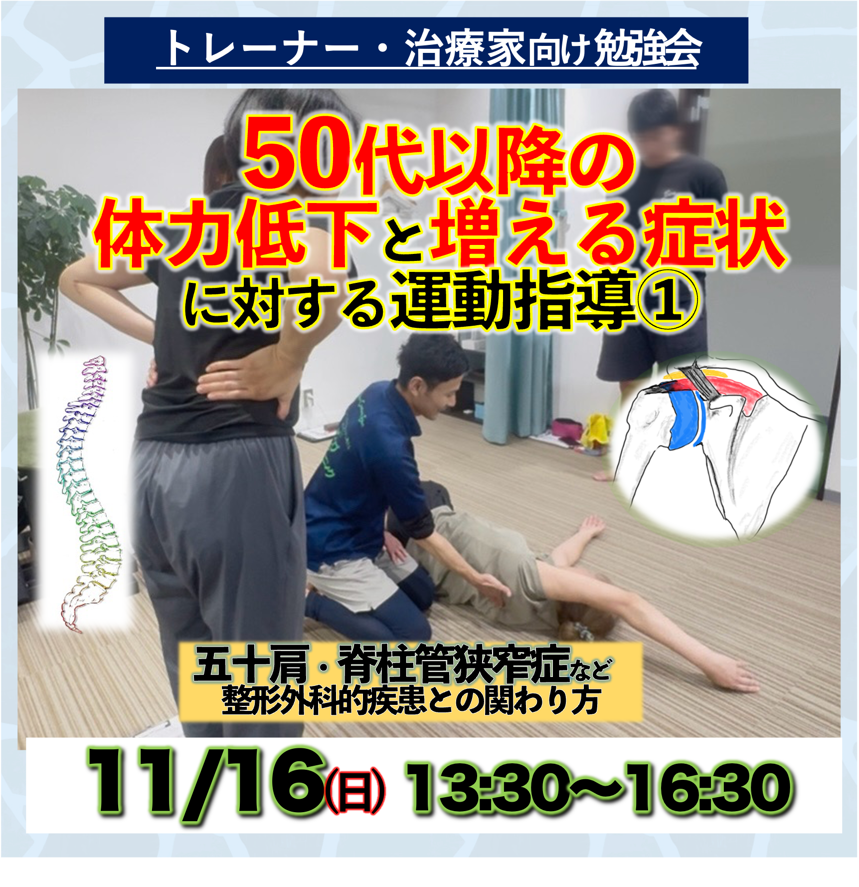 【 11/16指導者向け対面勉強会 】50代以降の体力低下と増える症状に対する運動指導① 〜五十肩・脊柱管狭窄症など整形外科的疾患との関わり方〜