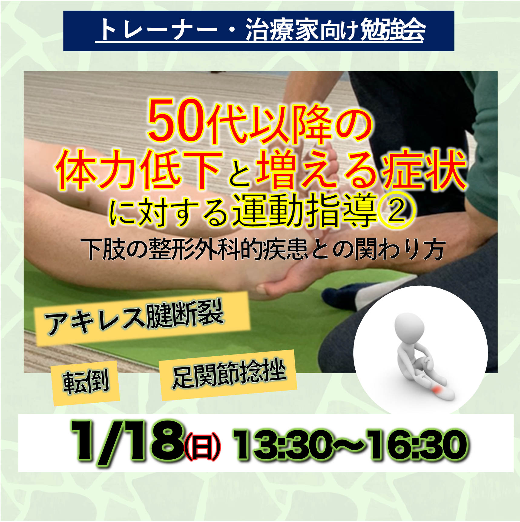 【 1/18指導者向け対面勉強会 】50代以降の体力低下と増える症状に対する運動指導②〜慢性的な膝痛、アキレス腱断裂、平衡感覚低下による転倒・捻挫など下肢の整形外科的疾患との関わり方〜